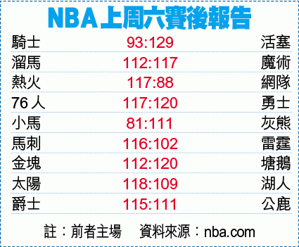 同日另一場,兩連敗的勇士雖有K湯遜(Klay Thompson)缺陣,但主將杜蘭特(Kevin Durant)復出,連同吉辛斯(DeMarcus Cousins)及史堤芬居里(Stephen Curry)共入87分,作客以120:117險勝有賓西蒙斯(Ben Simmons)交出大三元的76人。