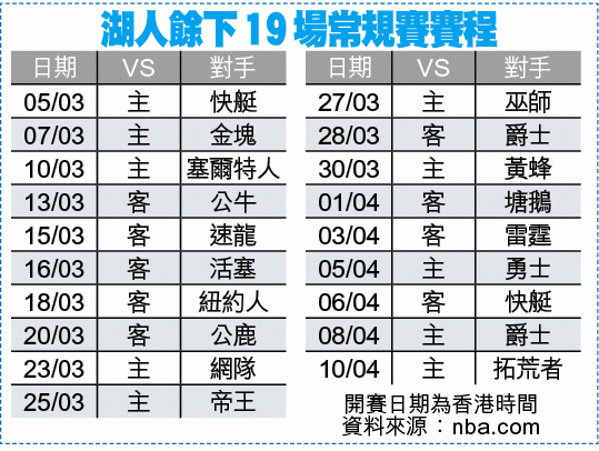 今仗湖人雖然有占士交出「準三雙」,而且職業生涯的入球已累積至11,726球,超越湖人名宿拜恩(Kobe Bryant),成為史上第五,可惜仍然難敵有狀元D艾頓(Deandre Ayton)交出「雙雙」26分及10籃板的太陽。賽後大帝受訪一臉失望,而小將古斯馬(Kyle Kuzma)更直接指出球隊內部明顯出現問題,需要及時修正。現時西岸第8的快艇及第7的馬刺勝率都超過54%,換言之湖人要趕上季後賽尾班車的話,在尚餘的19場常規賽中(見附表),至少要贏出14場,尤其兩鬥快艇不容有失。