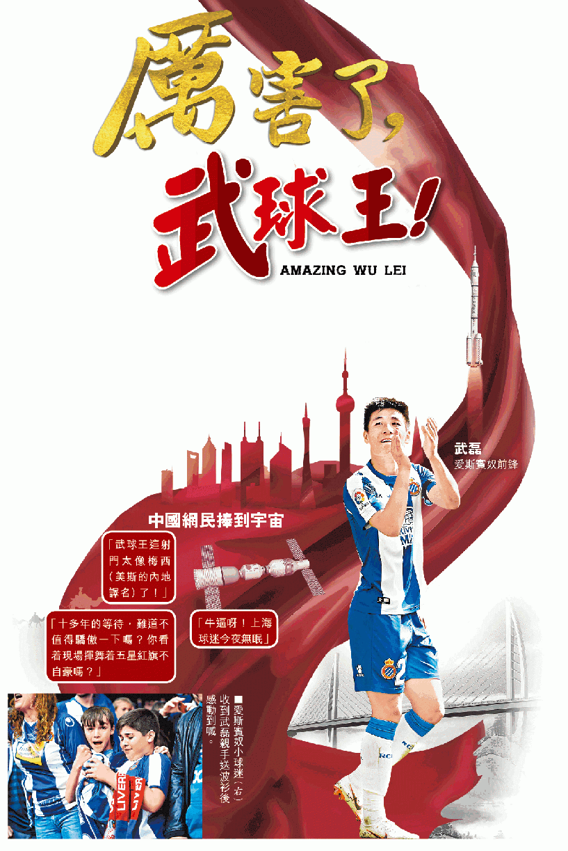 有中國球員西甲入波喎,梗係振奮13億人,而且武磊嘅表現都俘虜到愛奴球迷嘅心,佢完場後去觀眾席送波衫畀個小球迷,搞到小朋友激動到當場掩臉落淚,露出一副難以置信嘅表情,仲即刻着佢件新鮮熱辣24號波衫上身,而中國媒體同網民梗係即刻出動,內媒以「中國驕傲!武磊離場享受全場掌聲 他征服了西甲」起題,夠晒誇張,有網民都睇唔過眼,叫媒體唔好過份吹捧,將武磊形容到球王咁,盞畀佢更大壓力,起碼都睇多幾場,睇吓佢喺西甲企唔企得穩先。