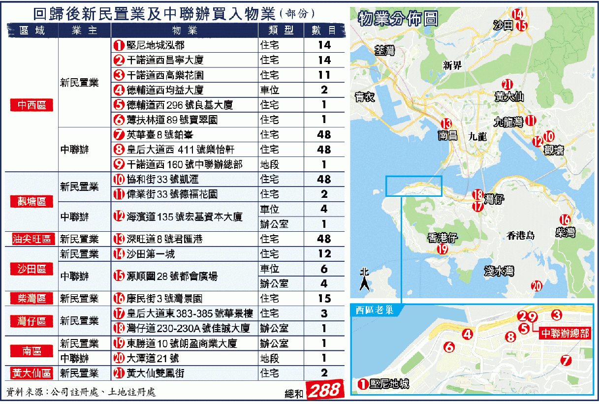外界一直以為近年在香港大手掃貨、樓價越掃越貴的新民置業是中聯辦子公司,而且買入物業是作員工宿舍用途,故毋須繳交印花稅。但本報翻查公司註冊處紀錄,發現在中聯辦架構中,新民置業並非中聯辦子公司,新民置業的股東及董事只是中聯辦員工。會計界立法會議員梁繼昌認為,關注點是這些公司行使的職能,包括購買物業是否中央人民政府賦權行事,否則也可以說是「自己員工炒樓」。
