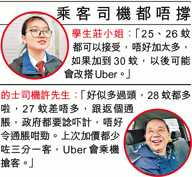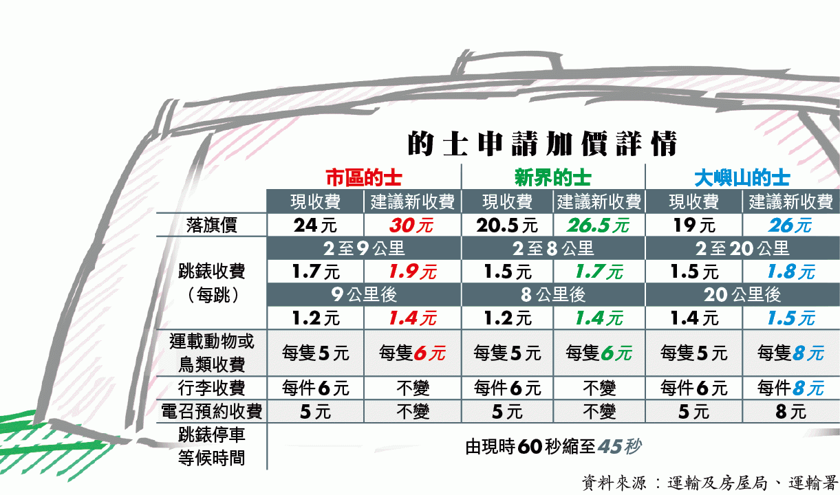 服務市區、新界及大嶼山的紅綠藍的士,前年4月獲批加價8.6%至11.15%,不過的士業界去年9月再向運輸署申請加價。其中紅的平均加幅20.39%,綠的22.89%,藍的更要求加25.71%。運房局提交立法會的文件指出,上次加價後的士司機首年平均月入略增至16,643元至18,648元,扣除通脹後實質增長1.85%至4.14%不等。同期間,因維修及保險等成本上升,車主未有明顯加車租,紅的車主實質收入較加價前反跌6.66%,降至約1.3萬元;新界及大嶼山的士車主,收入則微跌約1%。