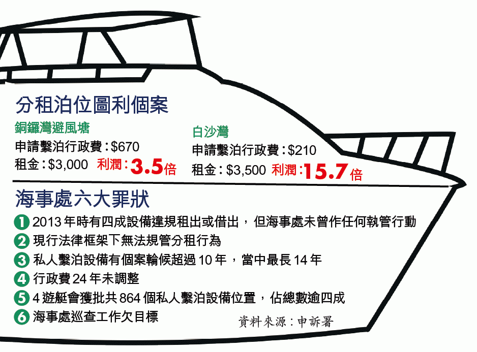 申訴專員公署調查發現,海事處2017年12月前批出的書面允許均訂明設備只供指定船隻繫泊,即不可出租或借出,但2013年海事處已發現,逾四成的繫泊設備並非由設備擁有人的船隻繫泊,反映出租或借出繫泊位普遍,按市值租金推算,有關收入可達數千元甚至逾萬元,成本僅為向海事處支付約數百元的行政費用。署方披露,有個案繳付210元行政費獲批繫泊位,但分租收取3,500元租金,謀取近16倍暴利。