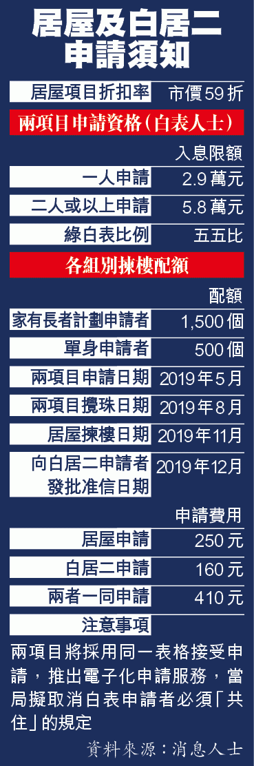 消息指居屋和今期白居二今年5月將一併接受申請,8月攪珠、居屋11月揀樓。就申請資格,綠表公屋戶需交還公屋單位,建議兩人及以上白表家庭入息限額由5.7萬元上調至5.8萬元、資產限額為201萬元;單身申請者入息及資產限額分別為2.9萬元及100.5萬元。以往房委會規定白表家庭申請時需與其表格中家庭成員共住,但消息稱房委會建議取消共住規定以配合實際需要。