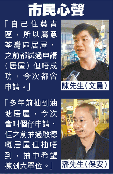 何文田冠德苑屬今期「居屋王」,該處屬豪宅地段,603個單位面積445至568平方呎,售價325萬元至529萬元,該處部份高層單位料可遠望海景,項目料今年9月底落成,即申請者揀樓時已有現樓可買。最多單位的將軍澳雍明苑則推售1,395個單位,單位面積282至568.3平方呎,售183萬元至455萬元,部份單位亦可望到海景。
