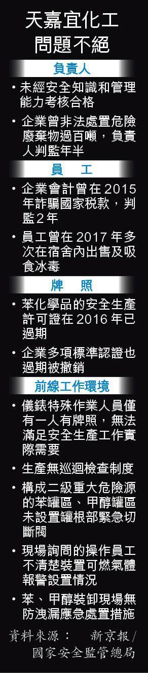翻查資料,天嘉宜在陳家港化工集中區亦似乎沒有履行環保的責任。公司在2016至2018年,6次被當地環境局行政處分,其中在2017年曾非法處置危險廢棄物超過100噸,觸犯污染環境罪,負責人張勤岳被判坐牢一年半,緩刑兩年。公司在2015年則被揭發虛開增值稅專用發票,騙取國家稅款,會計被判囚兩年。另外,前線工人在2017年多次在宿舍內出售、吸食冰毒,更誘使其他工人一同吸毒,最終在去年獲刑。應急管理部官方網站在2月8日亦狠評該公司前線生產情況,列出有13項安全隱患。