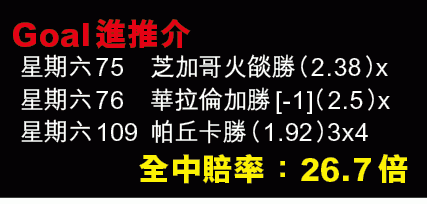 賭波有時都要拋開名牌包袱,好像美職聯,紐約紅牛、洛杉磯銀河等,由有過氣外援領軍,但始終名大於實;周六開季戰績平平的紅牛,作客芝加哥火燄,上季無疑紅牛作客贏1:0,但當時客W賠率約1.78倍,今仗客W已經有2.45倍,反映實力下滑,我信火燄今仗贏波開齋。