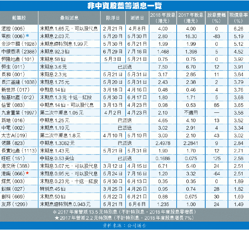 為方便閱讀,將50隻藍籌分為中資股及非中資股,數目大致一半半。先講非中資股,24隻股份中,只有5隻股息零增長,其餘皆錄得升幅(電能及港鐵如撇除特別息因素,分別是零增長及增加7%)。股息5厘以上的有3隻,分別是滙控(005)、電能(006)及金沙(1928),前者逾6厘息冠絕非中資股藍籌,全年維持派4港元。