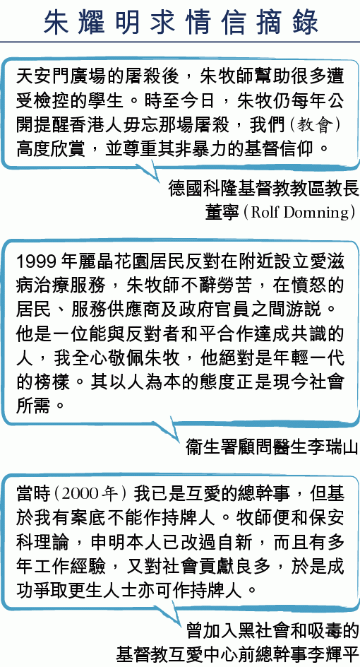 辯方呈交的多封求情信及文件,盡顯朱牧對社會貢獻,他自1980年起擔任有關撲滅罪行、禁毒、推廣愛滋病認知等公職,至今仍有職務在身。有德國教會撰信重提朱牧六四時參與黃雀行動;基督教互愛中心前總幹事李輝平在信中自述,曾加入黑社會和販賣毒品,更淪為道友,經常進出監獄,出獄後在中心工作認識朱牧。他憶述因自己學歷低,自覺得無法勝任宿舍舍監,獲朱鼓勵進修,朱牧更願意為有案底的他爭取成為院舍持牌人。