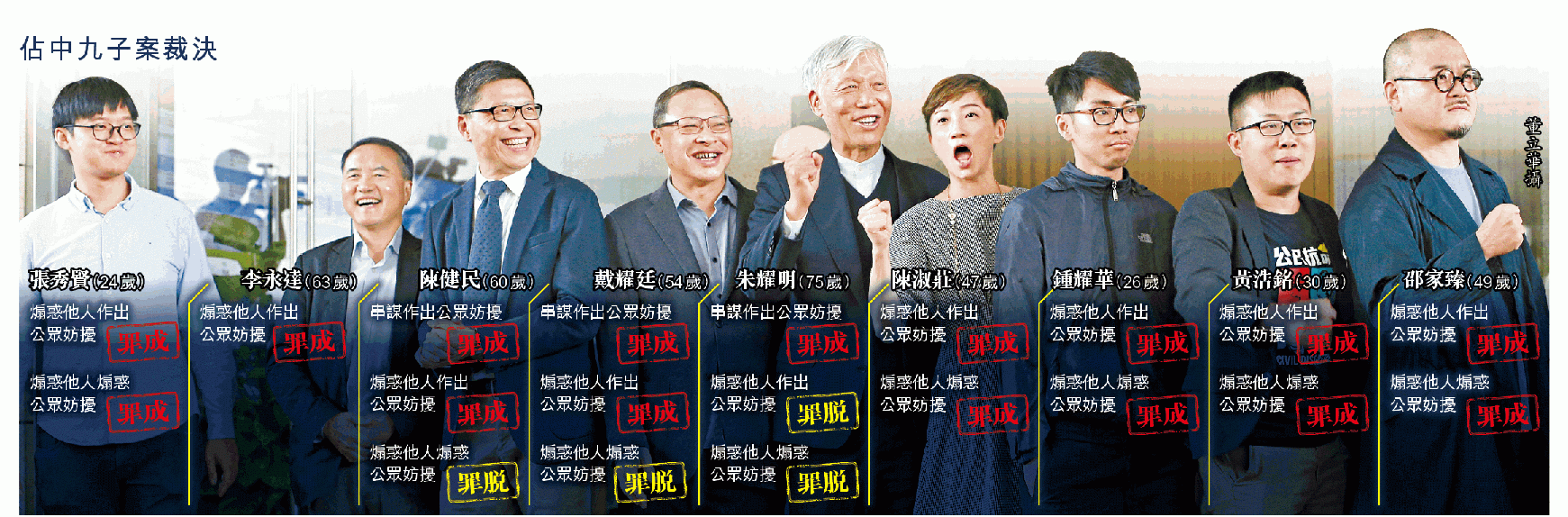 【本報訊】87枚催淚彈、79天佔領、數以萬計港人政治覺醒……2014年佔領行動,理想是全民公民抗命,但刑責最終落在佔中三子等九人身上。經歷18天審訊,法庭昨裁定九人全部罪成。三子首先展開求情程序,最年長的牧師朱耀明親自陳詞,哭着回顧一生,指催淚彈一幕令他腦海閃現六四事件畫面,又自言是敲鐘者,旨在喚醒人們良知,「如果我仍有氣力,必繼續在教會、在世上、在人心裏敲鐘」。戰友戴耀廷和陳健民不忍朱牧年邁,只求法庭不判朱牧入獄,「我寧願我代佢坐」。