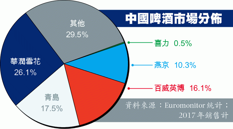 荷蘭合作銀行統計數據顯示,去年上半年百威英博啤酒在中國消費量超越美國。Euromonitor對中國啤酒市場研究發現,截至2017年,百威英博為中國第三大啤酒品牌,緊次於青島及華潤雪花。