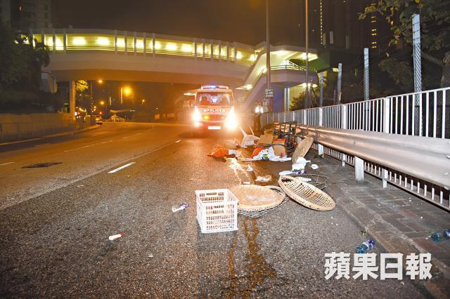 被撞重創的男小販姓林(67歲),據悉居於秀茂坪。昨凌晨2時許,林伯推着手推車沿協和街馬路逆線上斜,至祥和苑對開遭一輛沿協和街往物華街方向落斜的士迎面撞倒,林伯頭部受傷、滿臉鮮血倒地,陷半昏迷。林伯手推車被撞翻,車上數個紙皮箱、竹籃、膠凳、飲料等雜物翻落路面,佈滿一地。