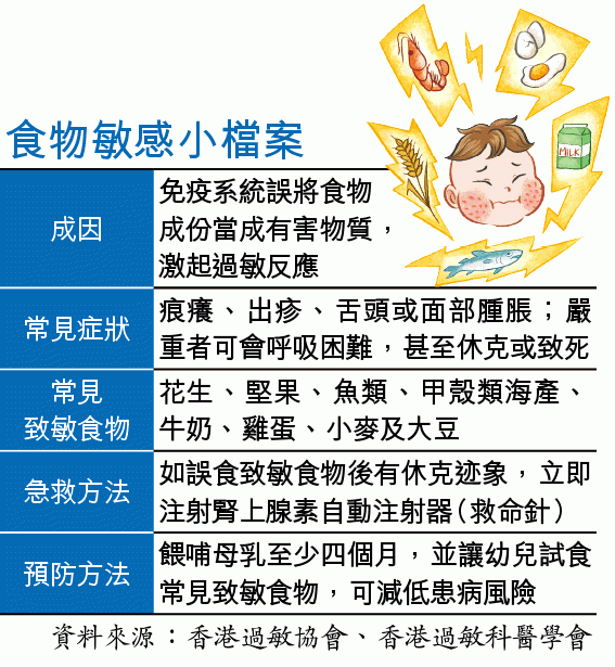 世界過敏組織將本星期定為「世界過敏周2019」,並以食物敏感為主題。全球各國有1%至10%人口患各類食物敏感,而本港估計約有5%兒童患者。食物敏感最常在3歲前首次發病,然後以驗血及皮膚點刺試驗等方法確診,之後透過食物激發測試確認致敏量。