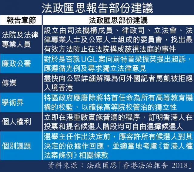 而在廉政公署章節中,報告關注律政司在UGL事件中未有尋求獨立法律意見,令公眾不能再確信受查人不會因其身份而獲任何優待或利益。去年多個參選人被取消資格,報告中的個別議題章節便批評選舉主任以不公平程序,剝奪包括香港眾志周庭、劉小麗和朱凱廸的被選舉權利,力促選舉主任作出決定時應容許候選人回應,並考慮《香港人權法案條例》的相關條款。