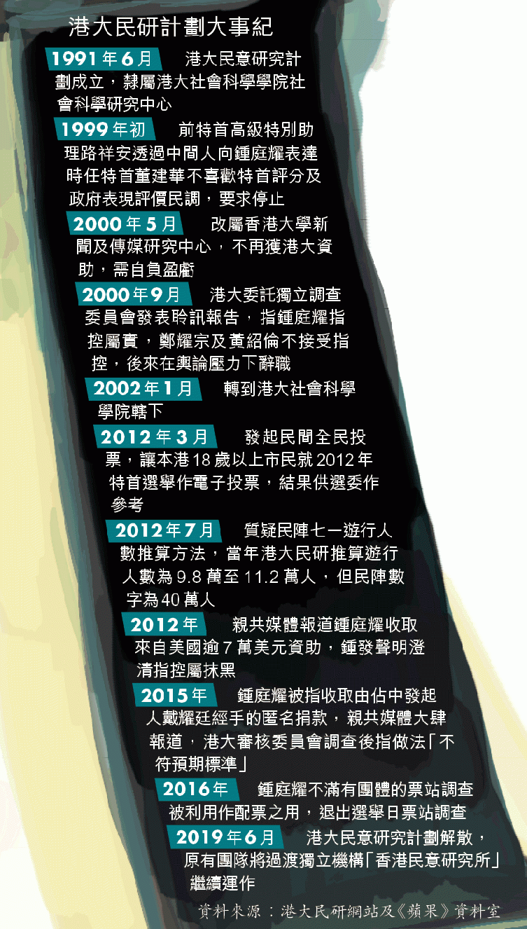 消息指,鍾一直被視為港府及建制派眼中釘,「以前大學都會想有多元化貢獻,想喺重大社會議題上有發言權,但問題𠵱家大學已經唔當(民研)係貢獻」。消息人士相信,跟港大「分手」是鍾在權衡如何保留多年心血、研究員生計等因素的折衷方案,「只可以話做一日和尚、敲一日鐘」。