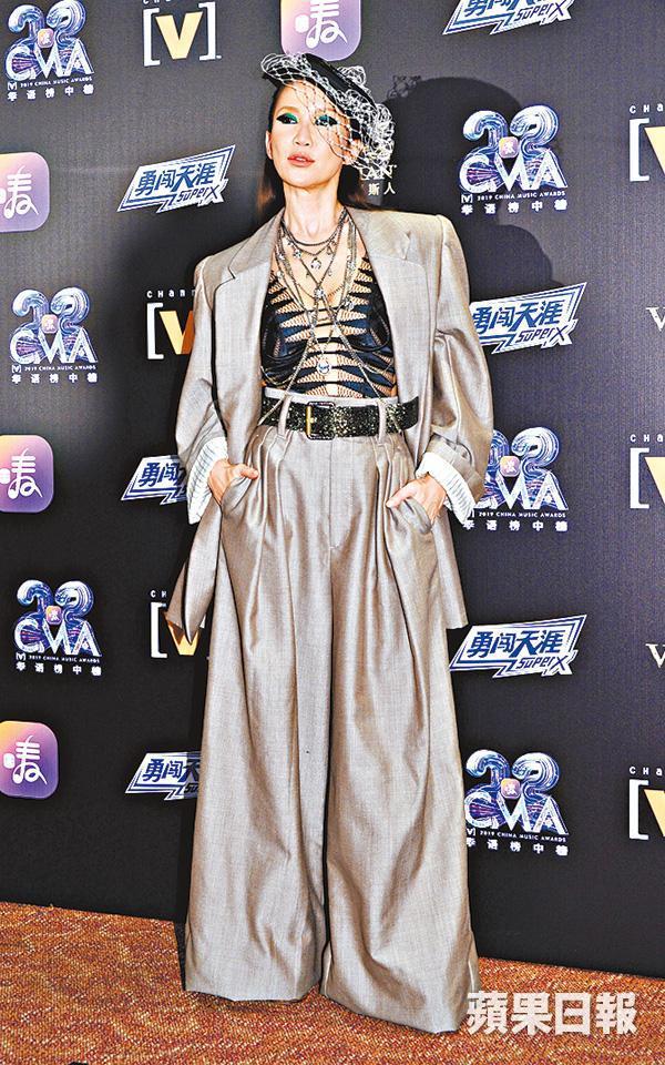 千嬅的Alice + Olivia水晶tube加黑色闊腳褲,造型利落有型,一頭紅髮加水晶choker點綴,搖滾味十足,不過相比起祖兒的色彩繽紛look,千嬅的暗黑look略遜。