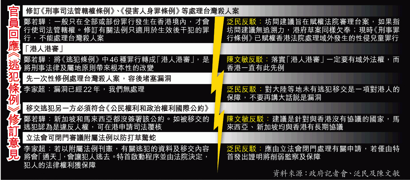 至於陳文敏建議香港不向無簽署並實施《公民權利及政治權利國際公約》國家和地區移交逃犯,鄭推說不符香港與其他地區簽訂長期移交逃犯協議的要求,譬如與香港簽訂長期協議的新加坡都沒有實施《公約》;再者坊間各建議沒有追溯力,處理不到修例前發生的台灣殺人案。