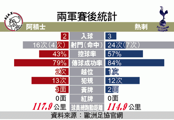 周三歐聯四強次回合,已半隻腳踏入決賽的阿積士迎戰熱刺,可惜在補時最後10秒,門將奧拿拿第三度被盧卡斯莫拉射破大門,最終因作客入球不及飲恨出局,未能重溫23年前殺入歐聯決賽的好夢,青春風暴告一段落。這次神奇之旅慘情告終,終歸還是敗在這支阿積士依然「too young」。