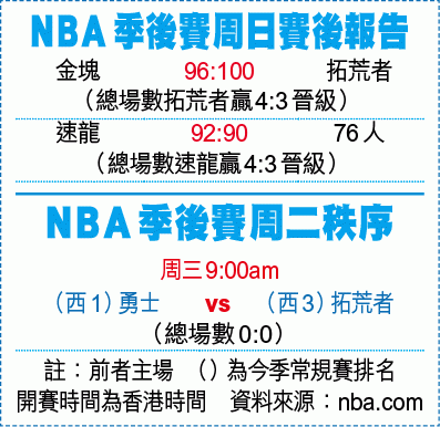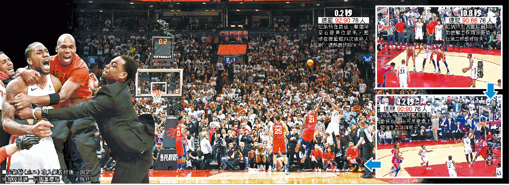 What a Game!周日NBA季後賽東西岸次圈2場搶7戰,東岸的速龍有尼納特(Kawhi Leonard)完場鐘響前起手一博,籃球在框上連彈四下終跌入,以季後賽史上首個搶七戰的壓哨入球,主場92:90絕殺76人;西岸的拓荒者有麥高倫(C.J. McCollum)攻入全場最高37分,作客100:96險勝金塊,兩支勝方同以場數4:3晉級分岸決賽。