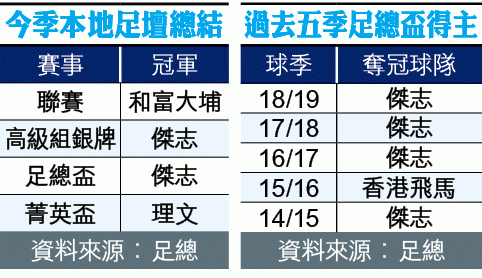 傑志與冠忠南區上周六在香港大球場上演的足總盃決賽,下半場尾段由盧卡斯及費蘭度各建一功,以2:0擊敗冠忠南區,繼衞冕銀牌後再蟬聯足總盃,並成為首支在此項賽事達成三連霸的球隊,更保住出戰來屆亞協盃資格。