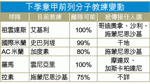 除AC米蘭,不少意甲前列球隊都有機會在今夏進行易帥。祖雲達斯與羅馬的主帥艾基利及雲尼亞里,已經確定會在季後離隊;前祖記與車路士主帥干地,幾可肯定會在代替史巴列堤,出任國際米蘭主帥,只待球會方面的正式公佈。至於今季助拉素贏得意大利盃冠軍的施蒙尼恩沙基,已成為市場上搶手貨,早前傳出成為祖記下任主帥候選人之一;而AC米蘭方面,亦被傳有意拉攏他接替加度素。