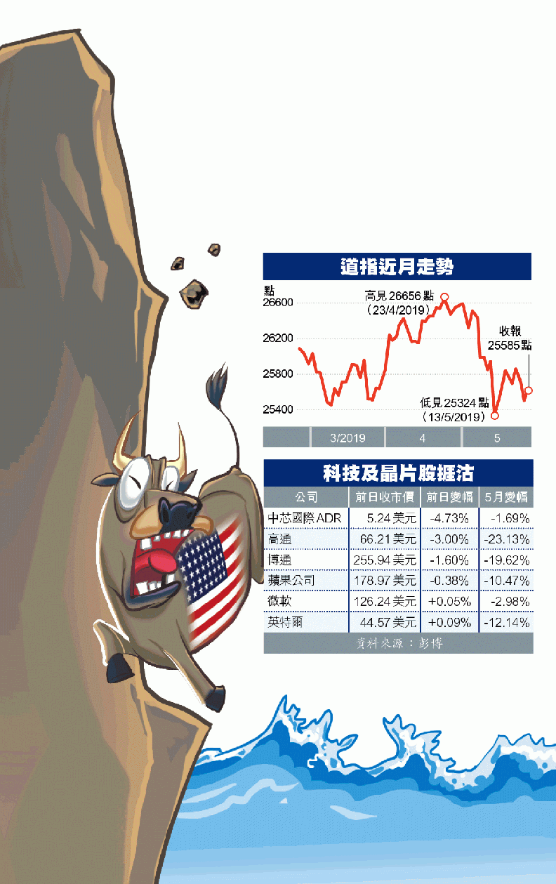 不過,特朗普言論未能抵銷中美貿易戰對股市的負面影響。道指上周累跌0.69%,連續五周下跌,是2011年6月以來最長單周連跌;標普500指數上周累跌1.17%,納指上周累跌2.29%。以點數計,道指於「五窮月」累跌1007點,標普500指數累跌119點,納指累跌458點。美股周一(27日)為陣亡將士紀念日,金融市場休市一日。