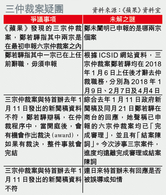 去年1月6日上任的鄭若驊,獲林鄭破例准許繼續處理六宗仲裁案。惟《蘋果》在國際投資爭端解決中心(ICSID)官網發現,鄭在上任後仍參與的三宗仲裁案中,案件資料卻於去年特首辦新聞稿形容已申報的六宗個案並不相符。