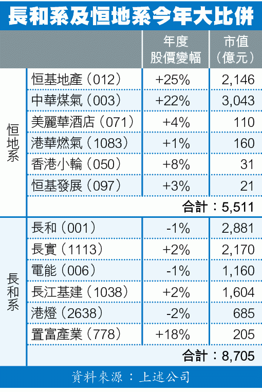 雖然恒指自年內高位回吐逾三千點,今年迄今仍有千五點或6%進賬,表現最好藍籌是中生製藥(1177),反彈逾四成,然後是即將退休的四叔李兆基旗下恒地(012)及煤氣(003),回報皆超過兩成。其他本地藍籌如新地(016)、新世界(017)及恒隆(101),回報介乎16%至20%,反觀李嘉誠上市旗艦長和(001)年內跌1%,長實(1113)亦只有2%回報。由去年3月宣佈會退休,至今超過一年時間,系內四隻藍籌市值蒸發逾1,700億元。