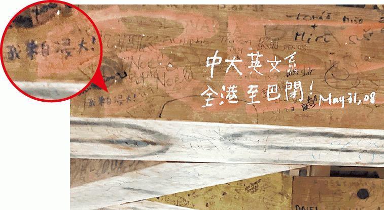 「中大英文系,全港至巴閉!May 31, 08」這條相信是11年前寫在木橋橫樑上的「題字」,在長長的橋廊上,分外鮮明,因為塗鴉使用的是白油,而且字體特大,與旁邊「我來自浸大」的藍色原子筆字迹相比,顯眼得多。