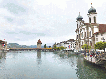 教堂橋建於1333年,是一條連接羅伊斯河(Reuss River)的行人木橋,也是歐洲最古老的木橋之一。木橋全長170米,橋頂底部掛了很多畫,是17世紀加上去的作品,描繪了教堂橋建造的過程。就是這些特色,每日吸引了世界各地的旅客慕名而來。