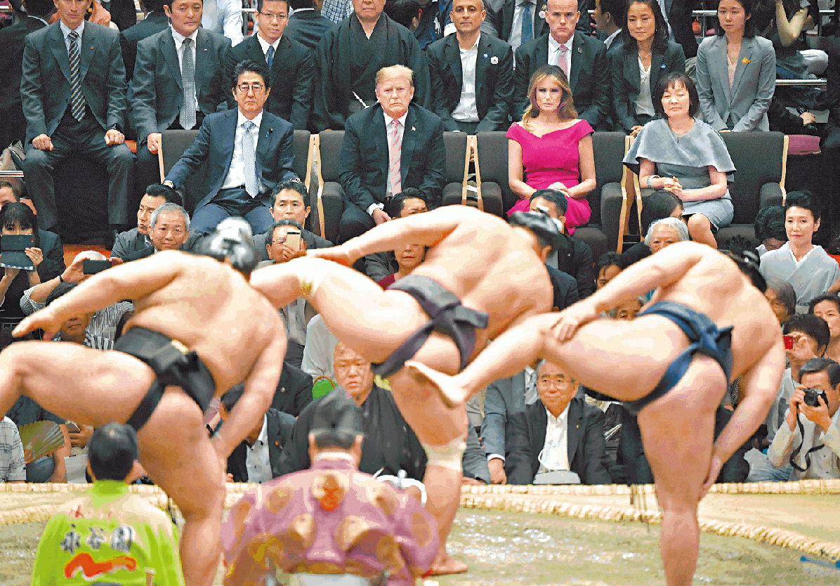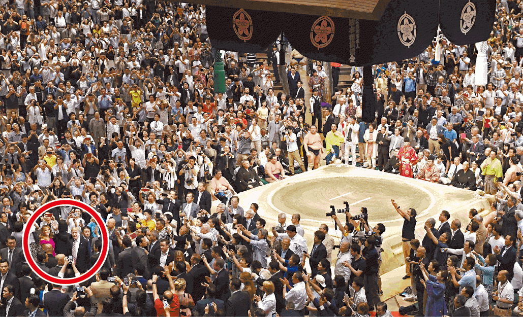 中午吃過以美國牛肉製的雙層芝士漢堡包後,安倍夫婦陪同特朗普夫婦,到東京兩國國技館觀賞大相撲夏季最後一場比賽「千秋樂」。這是首次有在任美國總統到場觀看相撲賽事,觀眾要接受嚴格安檢。不少人不滿酷熱中要排長龍,怨聲四起。觀眾中不少是老人家,有八旬老婦直言,特朗普到場「麻煩到極」。特朗普入場時,喝采聲當中亦可聞噓聲。