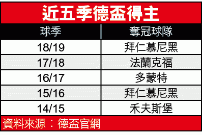 拜仁慕尼黑後上反壓多蒙特贏得德甲冠軍,上周六在德盃決賽亦憑羅拔利雲度夫斯基梅開二度,加上京士利高文的入球,大炒RB萊比錫成為本土雙冠王,以此歡送季後約滿離隊的「3R」洛賓、列貝利及拿菲爾。