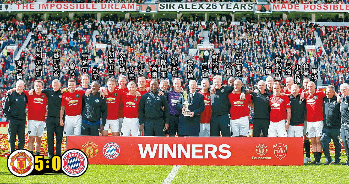 周日是曼聯1999年歐聯決賽奇蹟反勝拜仁慕尼黑2:1、成就3冠王霸業20周年,紅魔99傳奇隊相約拜仁傳奇隊演紀念賽,紅魔由已榮休的時任主帥費格遜領軍,碧咸、高爾、約基、舒寧咸、蘇斯克查等經典再現奧脫福,尤其碧咸七旋斬功架仍在,加上完場前扭波埋齋,領紅魔大勝5:0。