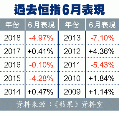 據本報統計,過去十年,有5年的6月份錄得跌幅,分別是2018年、2016年、2015年、2013年及2011年,機率是「五五波」。當中,2013年6月累計跌7.1%,除了是當年表現最差的月份,更是近十年跌得最傷的六月。當時美國退市憂慮持續、及內地拆息突抽高,拖累港股跌至全年低位,應驗「六絕」,其後人行表示已要求金融機構提供流動性支持,港股才見反彈。