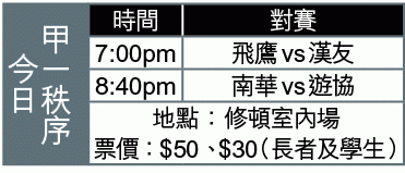 今季以全華班應戰的漢友同樣未嘗一勝,但這支以年輕為員為骨幹的升班馬拼勁十足,本月中76:97敗予東方一仗,仍能令對手出現不少麻煩。兩軍今仗對壘,相信將為球季首勝爭崩頭。