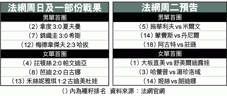 男單首圈賽事,「泥地王」拿度直落三盤以6:2、6:1、6:3輕鬆擊敗外圍賽球手、首次出戰法網的德國球手夏夫曼晉級。