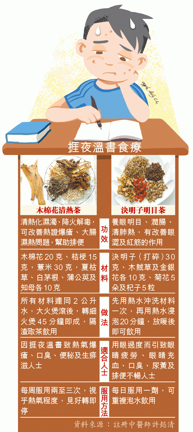 要捱夜溫書的人可自製兩款茶療飲用,許建議「木棉花清熱茶」可清熱化濕濁、降火解毒,適合因捱夜引致熱氣,造成爆瘡、口臭、便秘及生痱滋人士,材料包括木棉花、桔梗、薏米、夏枯草、白茅根、蒲公英及知母。另一款為「決明子明目茶」,適合溫書造成用眼過度,出現眼攰、眼睛充血、口臭、尿黃及排便不暢的人,此茶療有養眼明目、潤腸及清肺熱功效,材料包括決明子、木賊草、金銀花、菊花及杞子。