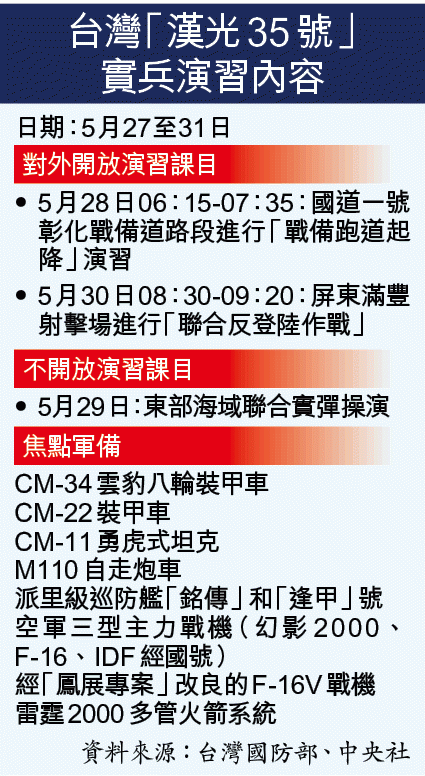 台灣自1984年起,每年都以大陸為假想敵進行「漢光演習」。「漢光35號」實兵演習昨日清晨在國軍衡山指揮所下達演習命令後正式開始,相較過往,此次演練的焦點包括經「鳳展專案」改良的F-16V戰機、搭載30毫米鏈炮的台灣自行研發「CM-34」雲豹八輪裝甲車、去年11月成軍的派里級巡防艦「銘傳」和「逢甲」號等新軍備,將首次納入操演。