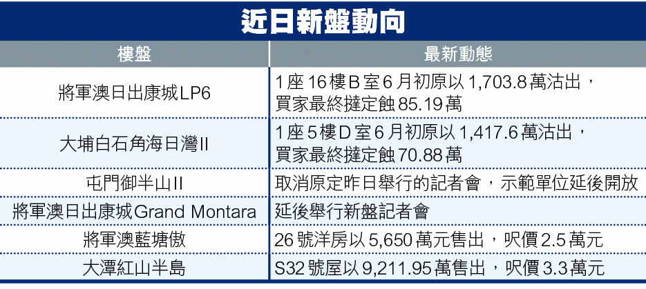 受昨日送中條例修訂案影響,多個新盤取消原定記者會,包括日前開價的新地屯門御半山II期,首批108伙折實平均呎價15,166元,發展商原本安排昨日向傳媒開放示範單位,並指將於月內開售。另外,會德豐將軍澳日出康城Grand Montara亦宣告延後舉行新盤記者會。
