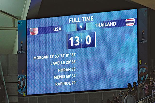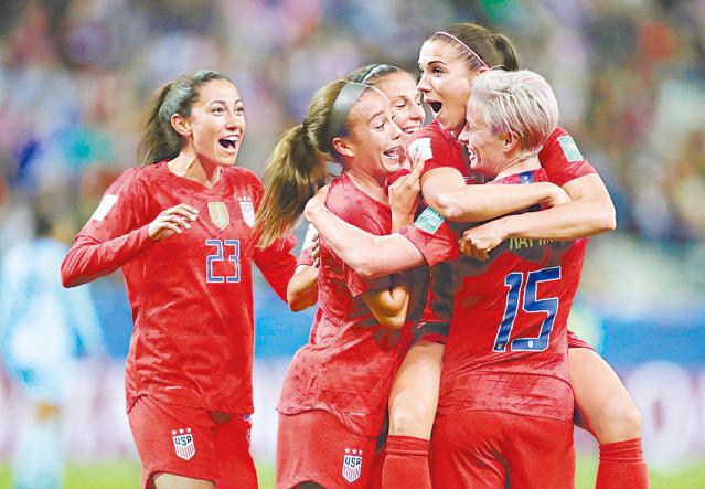周二女子世界盃分組賽,衞冕的美國在阿歷絲摩根(右二)轟入五球之下,在F組以13:0狂炒泰國,造出女子世盃單場最大比分差距。