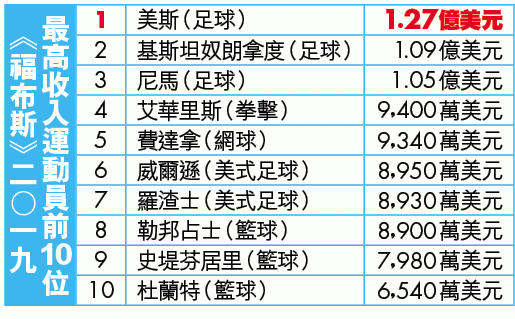 《福布斯》是根據運動員在2018年6月至19年6月所得的獎金、薪酬和廣告收益,去計算他們的收入,今年上榜的運動員,收入至少達到2,500萬美元(約1.96億港元),而且今次是《福布斯》運動員收入排名榜自1990年公佈以來,第一次由足球員包辦三甲。美斯以1.27億美元居首,是繼C朗後第二位在最高收入運動員排行榜登頂的足球員,其今年收入較排第2的C朗多出1,800萬美元,而尼馬則只稍輸C朗400萬美元排第三,但相信當《福布斯》下次再公佈收入排行榜時,最近捲入涉姦醜聞的他,有可能跌出10大。