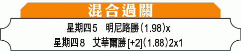 同日另一場,在榜首領放的彭美拉斯主場鬥包尾大幡的艾華爾。彭軍開季至今八場聯賽不敗,各項賽事更是九連勝,難以抵擋;相反艾華爾開季至今一場未勝,不過球隊有一定韌力,甚少大敗,故今仗開[-2]實在太多,寧撐艾華爾[+2]「客勝」。