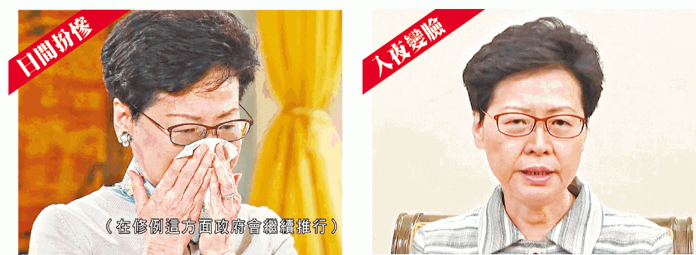 【本報訊】一手推動送中惡法的特首林鄭月娥面對大批市民再上街反送中惡法,甚至中彈血流披面,仍選擇龜縮不肯見記者,只接受親政府的無綫新聞訪問,到晚上再發表已錄製的講話,將警民衝突定性為暴動,並強烈譴責,同時堅持硬推惡法,不會撤回或押後。林鄭在無綫訪問中以眼淚「博同情」否認自己賣港,但表明不能向台灣殺人案受害人父母保證,可將兇手繩之於法。