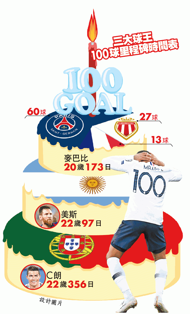 威水回到榜首的法國,勝利光環賽後當然戴在麥巴比身上。準確點來說,他的職業生涯100球是在20歲173日之齡創下,比起美斯及C朗兩大球王的百球里程碑都來得早。根據Opta資料,美斯達到100球紀錄時,年齡是22歲97日,C朗則更年長一點,在22歲356日才取得他的第100球。至於麥巴比的100球中,有13球是穿上高盧雄雞戰衣所射入,其餘87球則是為球會披甲時取得,其中60球是目前所效力的巴黎聖日耳門(PSG),而另外27球是在母會摩納哥出道那兩年轟入(見附表)。