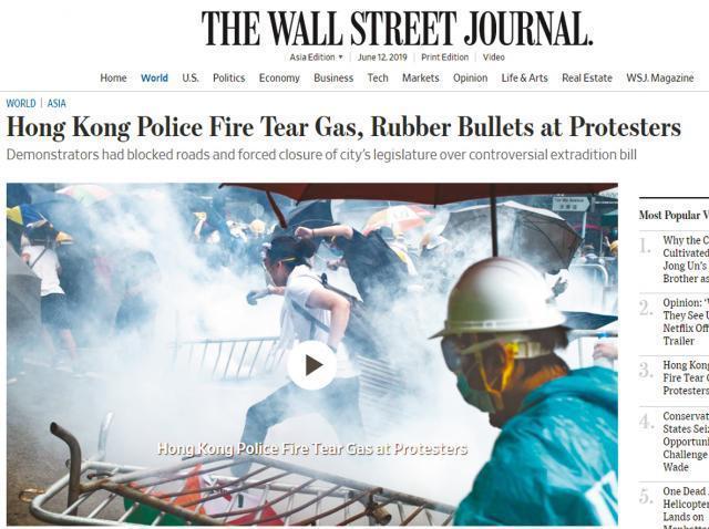 BBC頭條就以治安為重心,稱〈香港示威轉趨暴力造成混亂〉,並配上示威者反擲催淚彈的配圖。美國《華爾街日報》重點稍有不同,在衝突升級後,標題換成〈香港警察以橡膠子彈和催淚彈攻擊示威者〉,較早前標題則為〈數以萬計示威者促使引渡條例辯論押後〉。