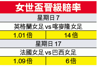 女子世界盃周日上演16強賽事,由英格蘭女足對陣喀麥隆女足,英格蘭論實力在喀麥隆之上,加上淘汰賽階段英軍避免夜長夢多,相信會力求盡早解決對手,今仗直取「讓球主客和」英格蘭女足[-2]的「主勝」。(球賽編號:星期日7;有線604台今日11:30pm直播)