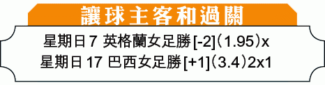 同日另一場16強,東道主法國女足雖在A組三戰全勝,但表現沒有如外界預料的那麼強勢,今仗對有女球王瑪達坐鎮的巴西,未必能輕鬆取勝,另外巴西前鋒姬絲汀娜對牙買加大演「帽子戲法」,博巴西可保不敗,「讓球主客和」[+1]可捧「客勝」。