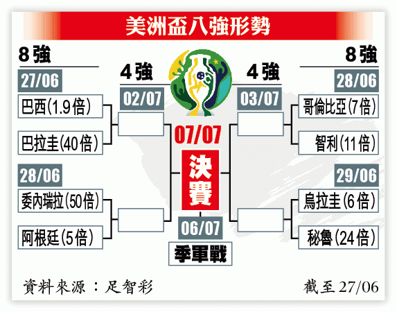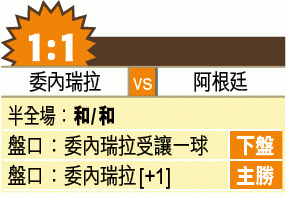 周五美洲盃八強,分組賽驚險出線的阿根廷面對三戰不敗的委內瑞拉。今屆賽事阿根廷表現令人失望,即便上仗面對實力差一截的卡塔爾亦毫無霸氣。今仗鬥表現相當硬淨的委軍,阿國讓一球寧博下盤。(球賽編號:星期五5;now650台明日3:00am直播)