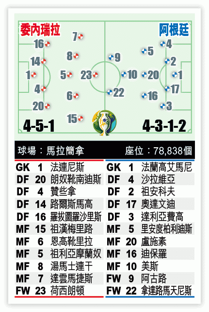 歸根究柢,現時的阿根廷要破密集有一定難度,前一仗對巴拉圭的比賽,巴拉圭的密集防守已令阿根廷吃盡苦頭。要不是球隊獲判一記12碼,讓美斯取得今屆暫時唯一入球,相反對手的12碼被門將法蘭高艾馬尼撲出的話,或許阿根廷已經「打道回府」。另一點是,阿根廷上仗面對卡塔爾時,阿根廷可以排出一個較為主攻的陣式,但今仗面對有一定實力的委內瑞拉,陣容的平衡或要再調整,上仗前線的化學作用未必復見。