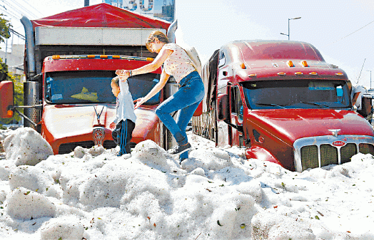 墨西哥中部城市瓜達拉哈拉(Guadalajara)受異常的雹暴侵襲,市郊至少6區前日地面積雹達兩米,有官員形容情況「前所未見」。