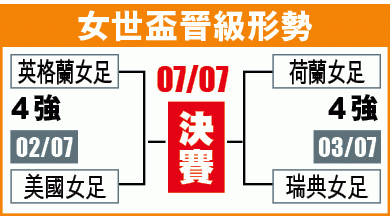 英格蘭今年女世盃表現極為出色,可說是其中一支奪冠黑馬。八強面對實力分子挪威,開賽短短三分鐘已經打開紀錄,最終以三球輕取對手晉級,其中大勇的射手艾倫韋芝該仗再有「士哥」,今屆已經攻入五球,暫時並列射手榜首位,今仗絕對有力在勁旅美國身上再取入球。